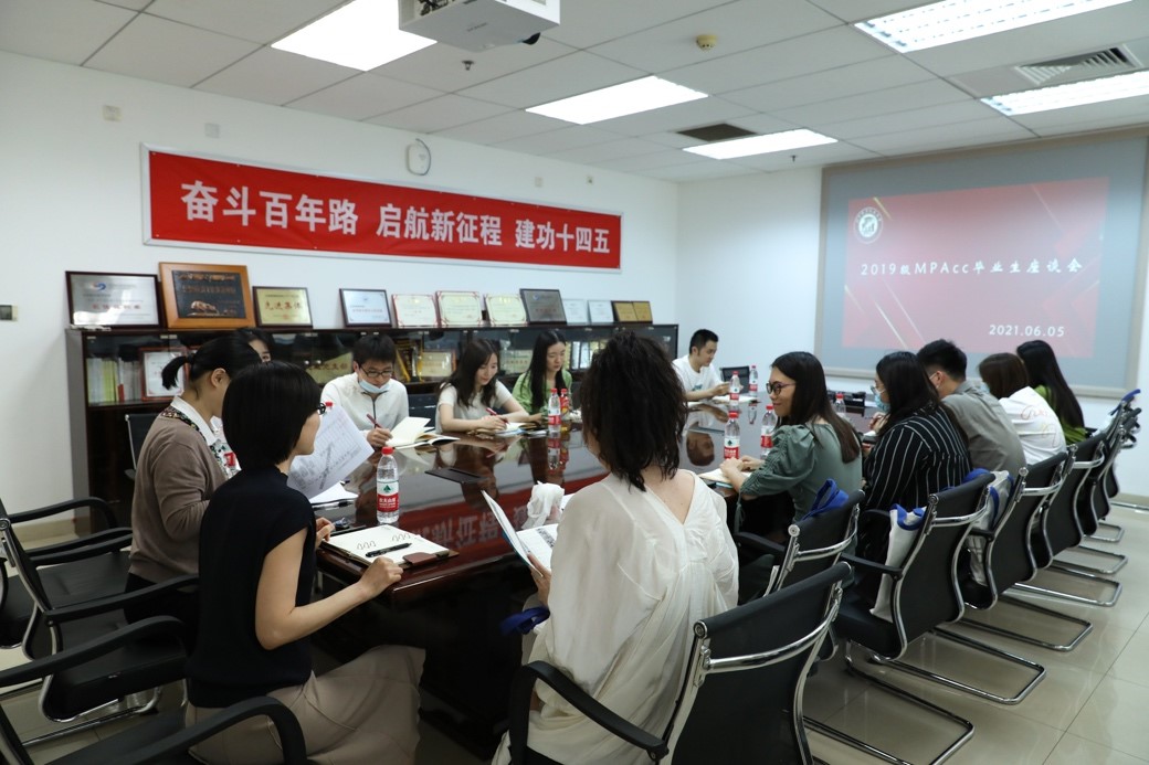 牟晖副院长做总结发言。她表示,感谢学生代表对于项目持续提升提出的建议,通过交流感受到了同学们对学院和项目的深厚感情和认可。学院将充分考虑同学们的建议,期待与同学们一起努力,共同提升经管学院MPAcc项目品牌质量。最后,牟晖副院长祝贺同学们圆满完成学业,希望大家毕业后常回母校看看!