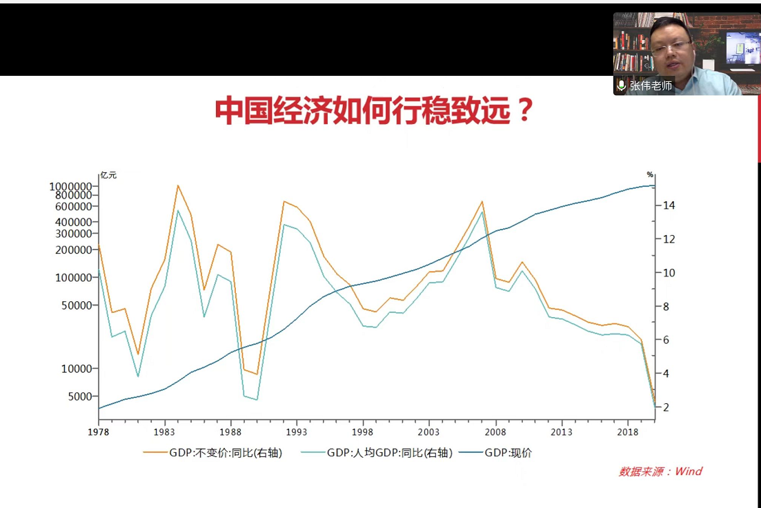张老师首先指出,当前全球形势复杂多变,主要表现在四个方面:其一,疫情蔓延是短期难以散去的阴影,新冠肺炎疫情是自1918年西班牙大流感以来传播速度最快、感染范围最广、防控难度最大的重大突发公共卫生事件。中国对于疫情的快速严密防控,长远来看,有利于快速复工复产和经济的恢复;其二,大国博弈使得全球治理体系正在深刻变革;其三,科技浪潮下信息技术革命将重塑经济;其四,经济长期增长动能减弱。