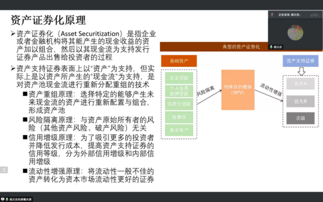 陈老师从资产证券化和REITs两部分展开授课。在资产证券化部分,陈老师从原理、参与人、资产证券化的两端及资产证券化在我国的三种实现形式等方面作了深入讲解,结合生动案例让同学们理解了资产证券化对发行人财务报表带来的影响。
