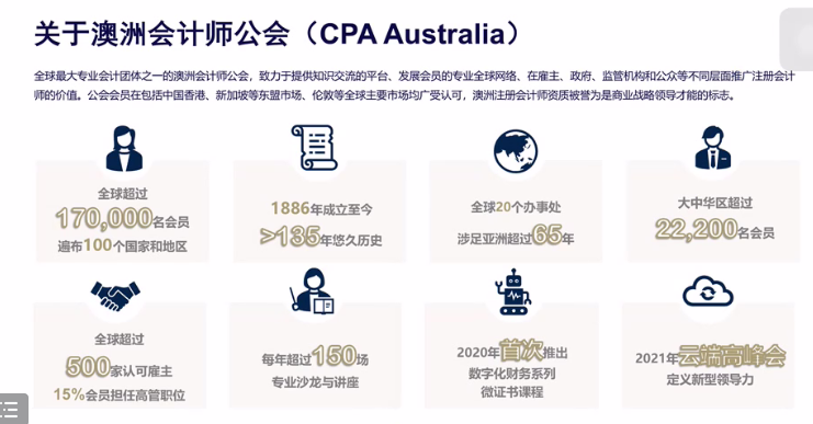 为增进同学们对澳洲会计师公会的了解,刘易斯先生向与会同学介绍了澳公会基本情况,包括发展历程、会员构成与权益、合作企业、课程体系、注册会计师考取等内容,并就同学们所关心的考试形式及相关免试政策进行了在线答疑。