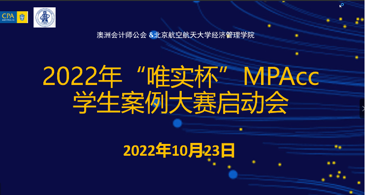 10月23日,北航经济管理学院与澳洲会计师公会联合主办的2022年“唯实杯”MPAcc学生案例大赛启动会于线上召开,大赛正式拉开帷幕。启动大会由经济管理学院MPAcc教育中心主任白明老师主持,澳洲会计师公会北京代表处首席代表、华北区域总监孟文静女士,业务拓展经理刘易斯先生出席会议,北航MPAcc教育中心工作人员及2022级全体MPAcc学生参会。