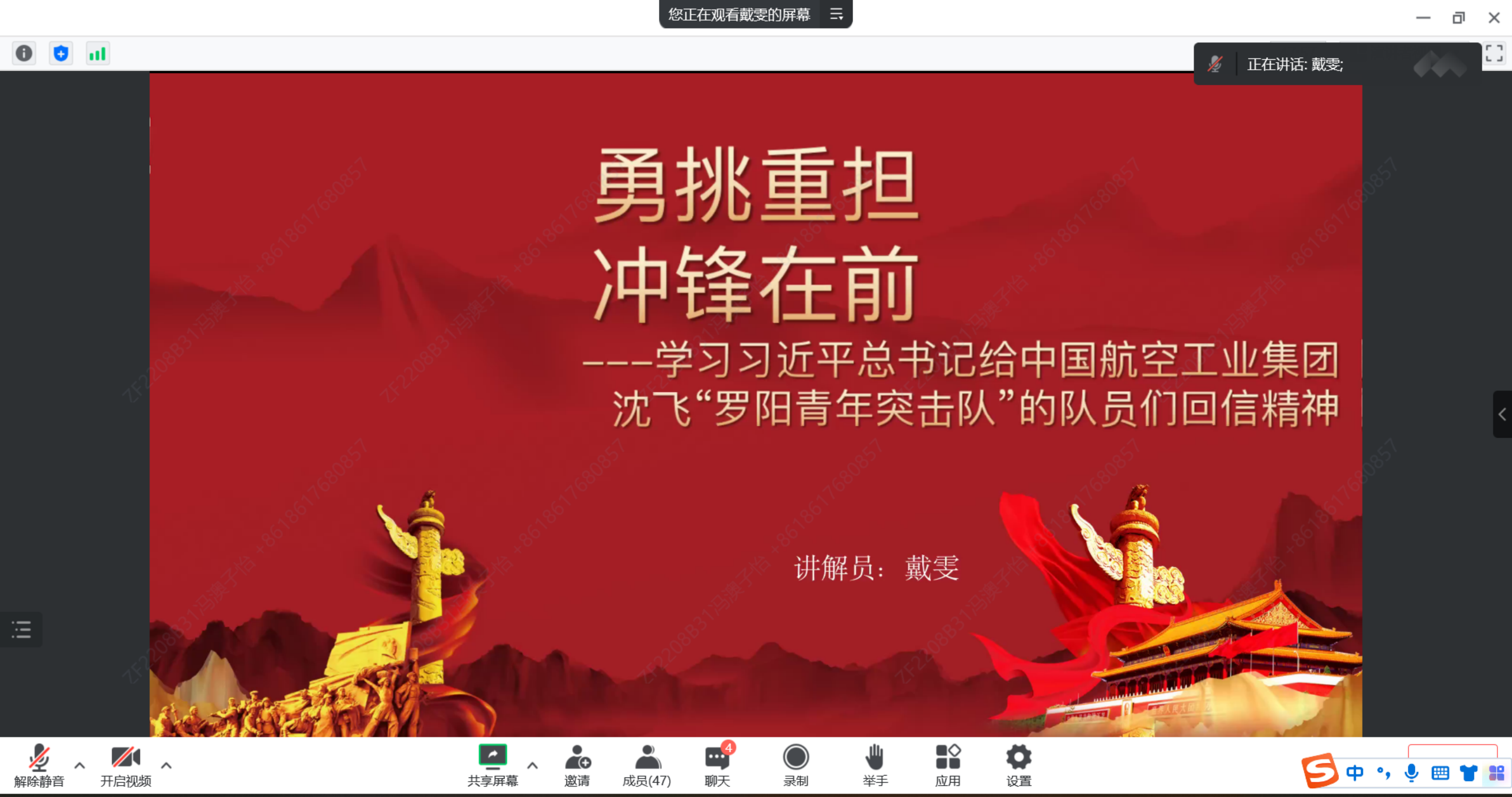 会计系学生纵向党支部学生党员戴雯传达了习近平总书记给中国航空工业集团沈飞“罗阳青年突击队”队员的回信精神,通过介绍罗阳同志的事迹和精神,鼓励全体党员同志争做有理想、敢担当、能吃苦、肯奋斗的新时代好青年。