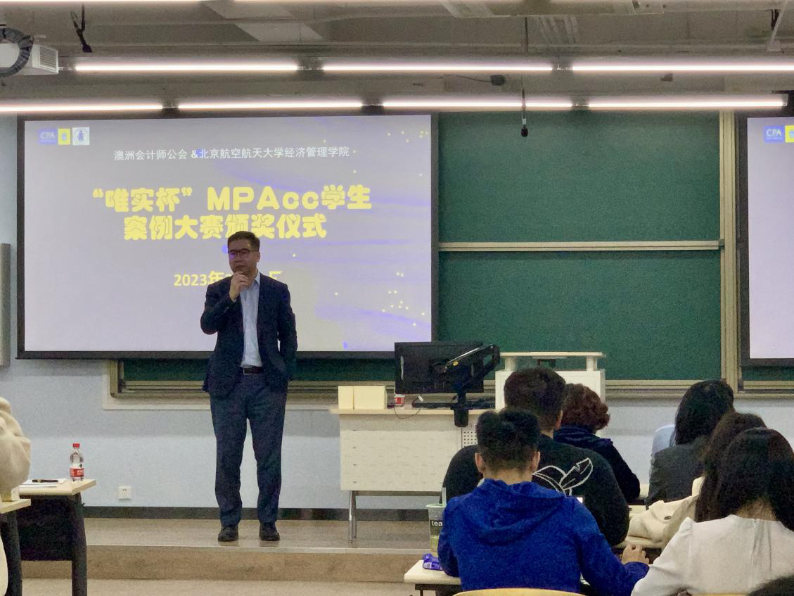 “向阳草木青,明媚春光暖,春天的美,俯拾皆是。”3月11日晚,北航经管学院“唯实杯”MPAcc学生案例大赛颁奖仪式在学院路教学区5号楼112教室隆重举行。2021级、2022级MPAcc研究生共百余人参加活动,澳洲会计师公会北京代表处首席代表孟文静女士、华北区委员会会长彭飞先生、财政部中国注册会计师协会国际及港澳台事务部主任宋祉健先生、中国铁建财务有限公司副总经理薛志辉先生、北京奔驰汽车有限公司战略与内部控制高级经理左晓帆女士、北航经济管理学院副院长牟晖副教授、周宁教授、MPAcc教育中心副主任任晖老师出席颁奖仪式。仪式由经济管理学院MPAcc教育中心主任白明副教授主持。