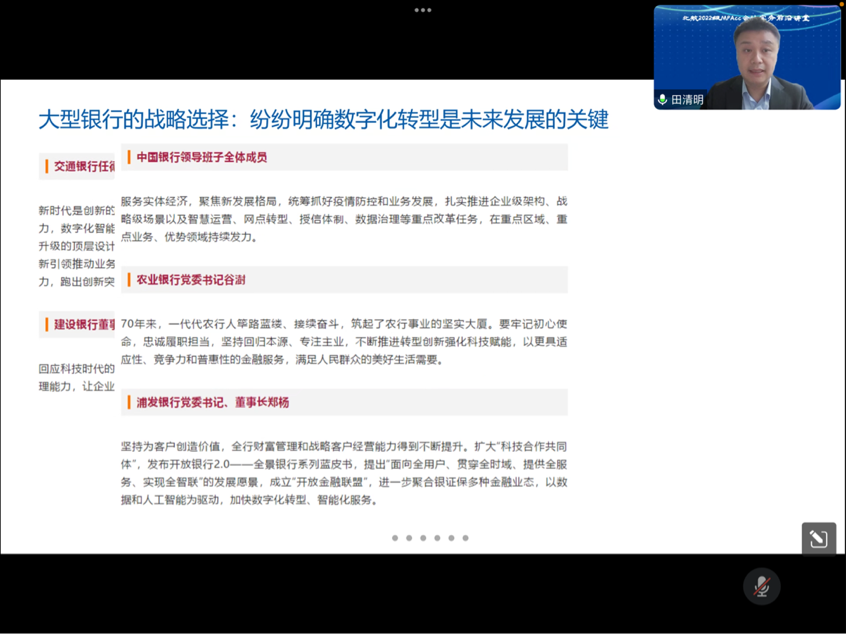 讲座伊始,田清明老师从国家战略层面为同学们剖析了银行数字化转型的必然性:数字经济、数字化转型是国家未来发展的关键词;国家各部委在“十四五”规划纲要中纷纷提到数字化转型;党的二十大报告提出“要加快发展数字经济,加速数字化转型”;中共中央、国务院印发了《数字中国建设整体布局规划》,其中金融数字化是产业数字化要求中重要的组成部分……
