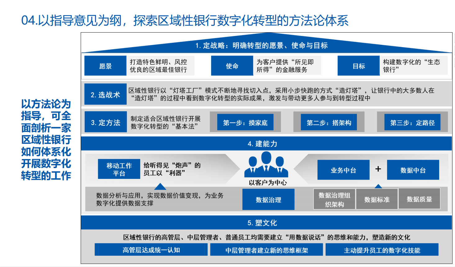 区域性银行数字化转型的目标是融合全行的重点资源,打通业务与科技,驱动数据资产的激活与使用,全面提升经营管理的能力与效率。为达到这一目标,需要以顶层设计来驱动组织变革,以流程优化带动业务重塑,开展“业技数融合”工作来发挥科技与数据的更大价值,不断完善数据治理与数据应用工作,同时需要建立数字化转型任务的后评价机制,这样才能形成数字化转型闭环,帮助银行成功转型。